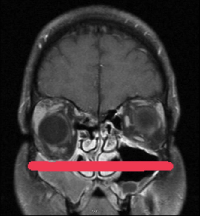 Exame de ressonância magnética com rebaixamento do assoalho da órbita direita